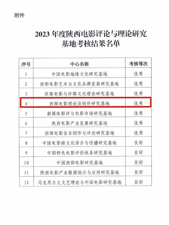 近日,中共陕西省委宣传部公布了2023年度陕西电影评论与理论研究基地考核结果,全省共有12家单位参加此次考核。KY.COM“西部电影理论及创作研究基地”表现突出,荣获“优秀”等级。