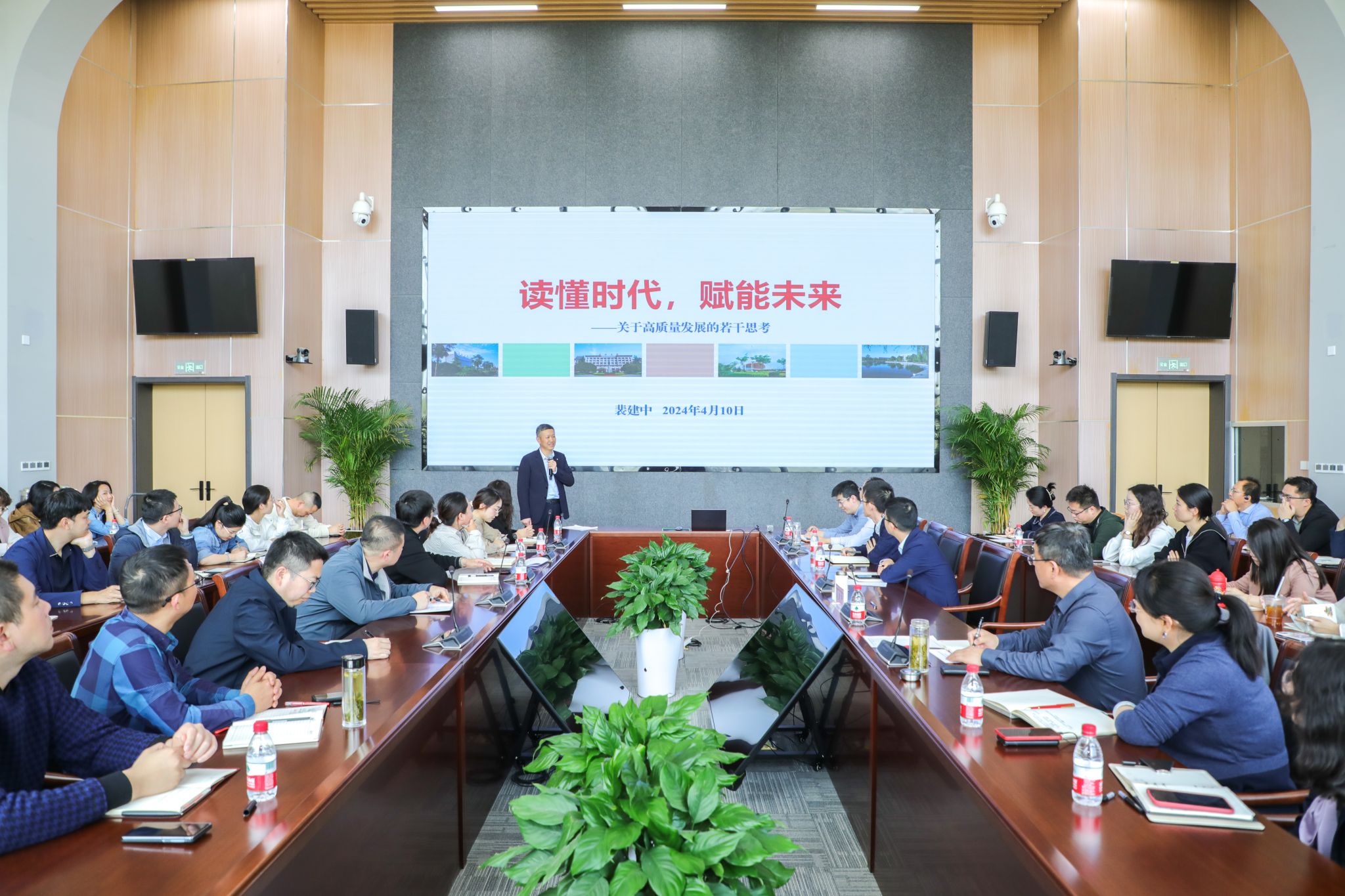 4月10日下午,机关青年论坛第七期暨高质量发展专题党课在北校区师生服务大厅第一报告厅举行。副校长裴建中以“读懂时代 赋能未来——关于高质量发展的若干思考”为题作专题报告。论坛由机关党委书记李金和主持。