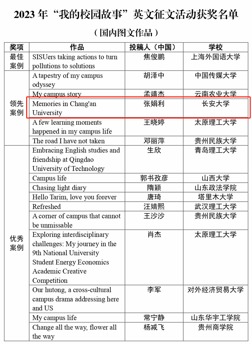 近日,由中国日报社主办,21世纪报社、中国日报客户端、中国对外政务信息服务平台·留学中国联合承办的2023年“我的校园故事”英文征文活动获奖名单揭晓,KY.COM外国语学院教师张娟利的作品《Memories in Chang'an University》获“领先案例”奖。