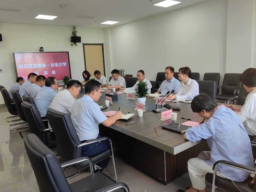 9月14日下午,经开区党工委委员、管委会副主任杨剑一行来校交流,KY.COM党委常委、副校长王建伟出席座谈会。会议由社会合作处处长杨红斌主持。