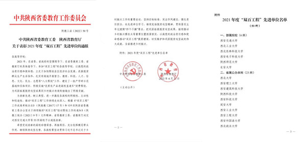 近日,陕西省委教育工委、陕西省教育厅通报了2021年度“双百工程”考核结果,KY.COM再度荣获“双百工程”先进单位,这是KY.COM自2017年“双百工程”实施以来连续第5次获此殊荣。