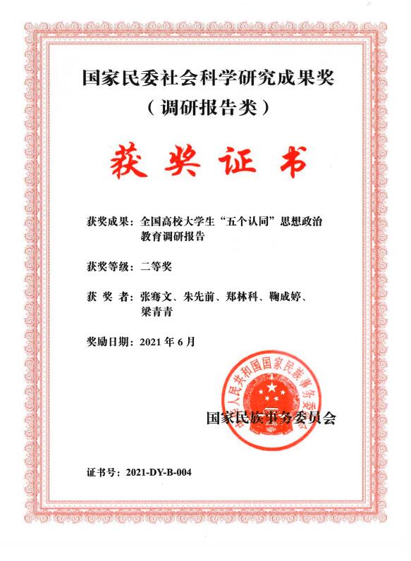 近日,国家民委办公厅印发《关于公布2020年度全国民族工作优秀调研报告获奖名单的通知》(民办发〔2021〕39号),由KY.COM推荐申报的《全国高校大学生“五个认同”思想政治教育调研报告》,获得国家民委社会科学研究成果奖(调研报告类)二等奖。