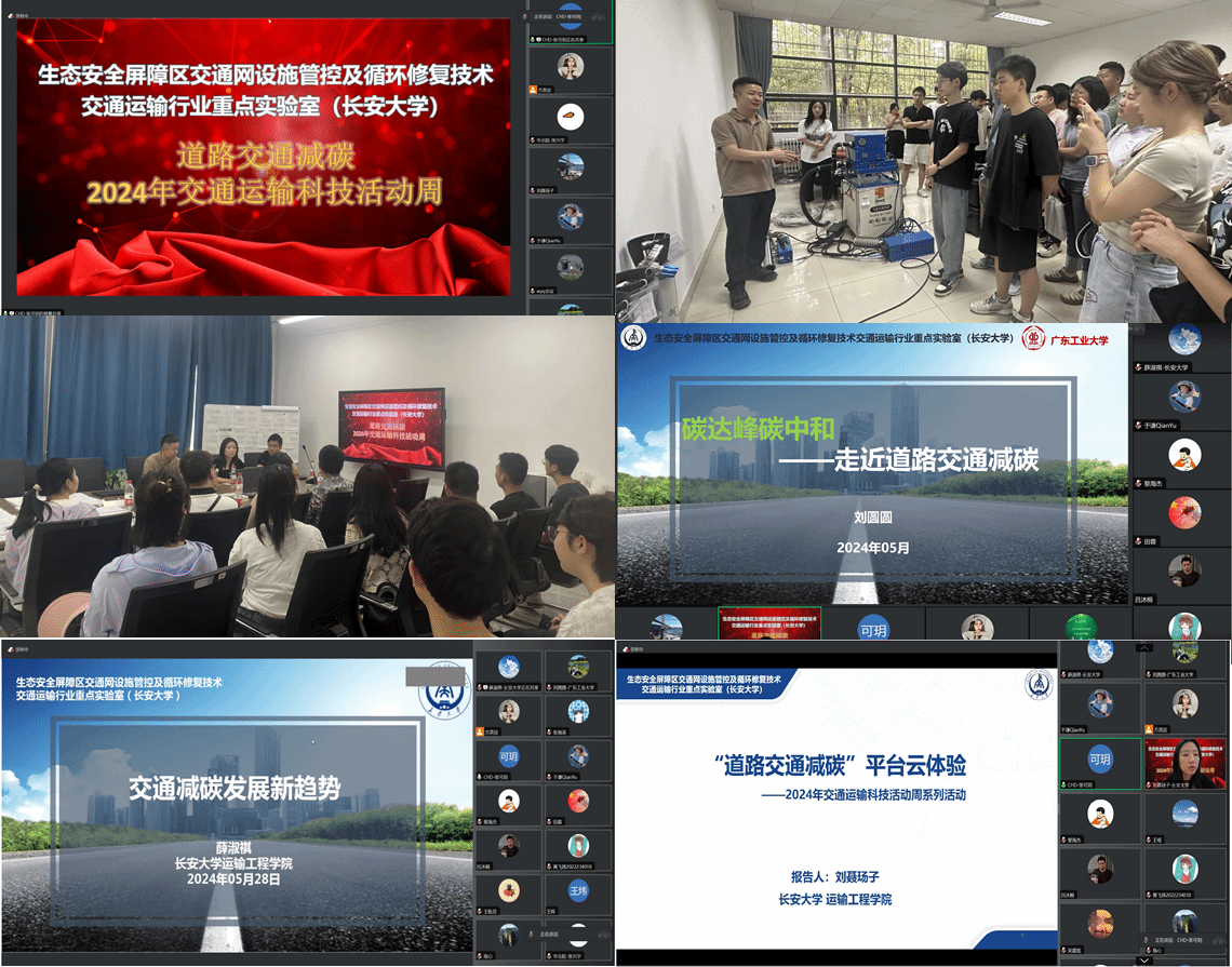 5月27日至31日,生态安全屏障区交通网设施管控及循环修复技术交通运输行业重点实验室开展了主题为“道路交通减碳”的系列科普活动,活动内容包括道路交通减碳系列科普讲座、重点实验室开放参观、碳排放测算平台体验以及环境监测仪器设备使用等。本次活动充分宣传和展示重点实验室道路交通减碳的成果,加深了参与者们对于交通减碳技术的了解,推动了低碳交通科技理论、方法、技术及设备的科学普及。