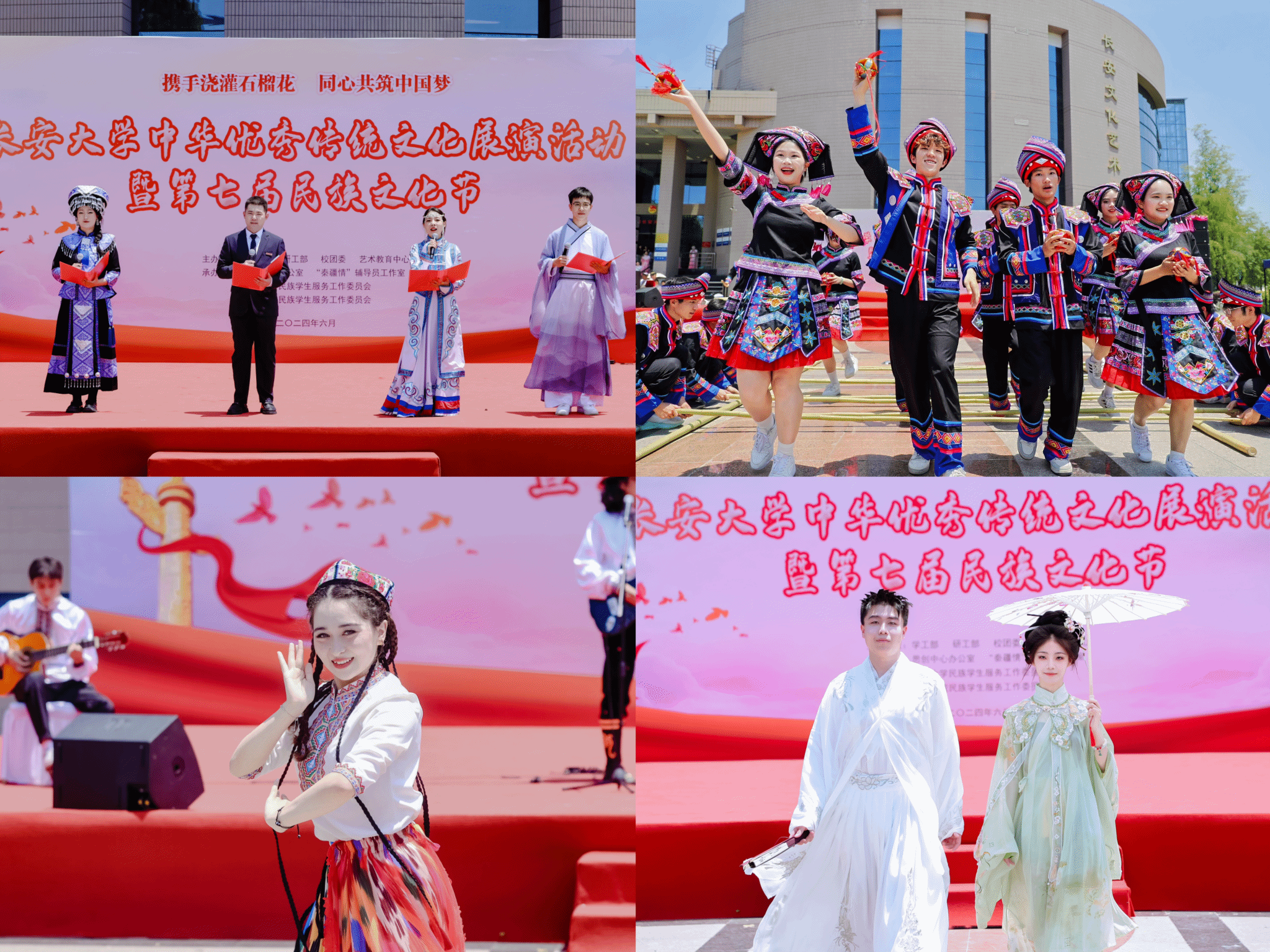 民族文化节以多民族服装秀开场,舞蹈《美丽中国》紧随其后,各民族同学手牵手、肩并肩,伴随着欢快的节奏热情舞动,展现了绚烂多彩的民族风情;蒙古族歌曲《鸿雁》诉说着蒙古族人民对自然的热爱与敬畏;朗诵伴舞《浮光》以紧紧抱在一起的石榴籽作比,用气势磅礴的舞蹈和饱含深情的朗诵诉说着对祖国的无限热爱;藏族舞蹈《色金梅朵》舞出了藏族同胞辽阔宽广的胸怀;歌曲《掀起你的盖头来》将民歌与摇滚融合,将现场氛围推向高潮,老师和同学们纷纷走入舞池参与互动;土家族舞蹈《武陵足音》、哈萨克族舞蹈《石人与天鹅》、维吾尔族舞蹈《麦西来甫印象》、壮族舞蹈《竹影欢歌》以及汉族舞蹈《安塞腰鼓》,或婀娜多情,或豪迈雄壮,别具一格,引人入胜。民族文化节在温婉灵动的舞蹈《忆江南》中缓缓落下帷幕。广场人头攒动,现场气氛热烈。