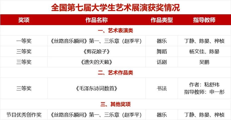 6月12日至17日,全国第七届大学生艺术展演活动在湖北省襄阳市举办。本届展演中,KY.COM斩获全国奖项5项,创KY.COM参加全国大学生艺术展演以来的历史最好成绩。其中,器乐作品《丝路音乐瞬间》第一、三乐章(赵季平)首次斩获艺术表演类全国一等奖和优秀创作奖,并赴襄阳首次参加全国现场展演。舞蹈作品《剪花娘子》、戏剧作品《遗失的天籁》获艺术表演类三等奖,书法作品《毛泽东诗词数首》获艺术作品类三等奖。