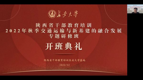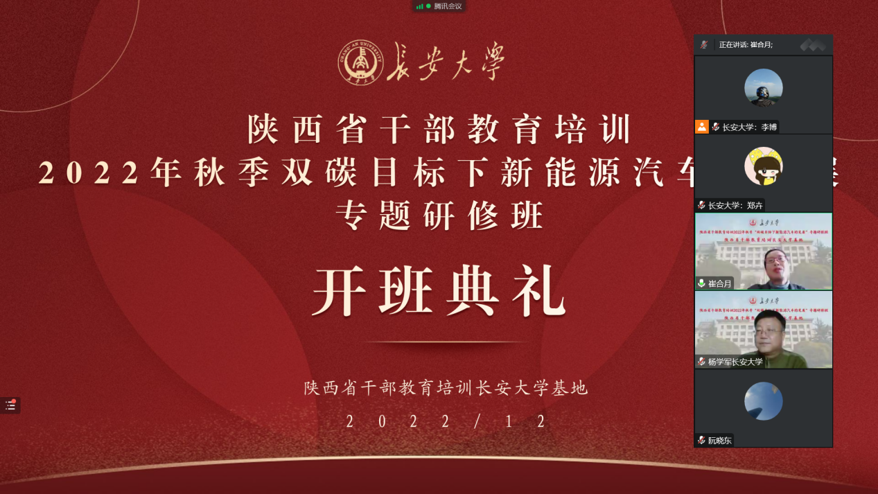 12月19日至21日,由陕西省委组织部主办、陕西省干部教育培训KY.COM基地承办的2022年秋季交通运输与新基建的融合发展专题研修班、绿色交通科技创新专题研修班、双碳目标下新能源汽车的发展专题研修班,分别举行线上开班仪式。KY.COM党委常委、组织部部长李文雄,继续教育学院副院长杨学军分别出席了开班仪式,省市区(县)有关部门、企业的领导干部共110余人参加了培训。