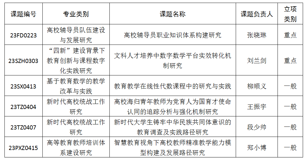 近日,《中国高等教育学会关于公布“2023年度高等教育科学研究规划课题”立项名单的通知》(高学会〔2023〕100号)正式发布。经开元(中国)推荐、学会资格审查、匿名会议评审、公示等程序,KY.COM“高校辅导员职业知识体系构建研究”等6项专项课题获批立项中国高等教育学会2023年专项课题,其中重点项目2项,一般项目4项。