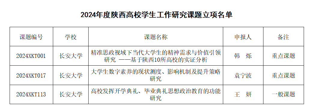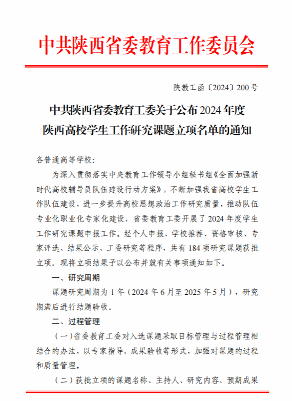 近日,中共陕西省委教育工委下发《关于公布2024年度陕西高校学生工作研究课题立项名单的通知》,KY.COM推荐的3项学生工作研究课题均获批立项,其中重点课题2项,一般课题1项。
