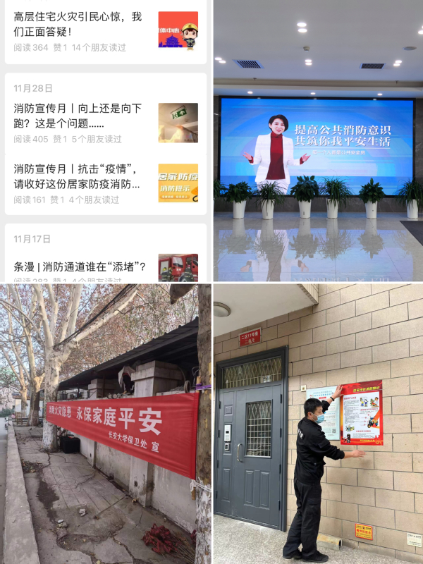 “119消防宣传月”活动开展以来,各校区利用电子屏幕、横幅、海报等方式进行消防安全宣传,并通过校保卫处“平安长大”微信公众号,就畅通消防通道、居家防疫消防知识、高层住宅逃生自救等内容推送了系列宣传图文6篇,营造了人人关心消防、时时防范风险的校园文化环境。