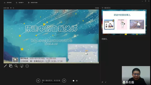 晚上7点,心理健康教育与咨询中心副主任张石磊在“虹”学讲堂(353讲)以“研途中的自我关爱”为题开展讲座,600余名研究生在线参加。张石磊以调查问卷的形式,了解研途中学子们遇到的现实心理困难,以此引出“自我关怀”的主题,通过阐述自我关怀的内涵、积极效应和误区,指导学生进行自我关怀。张石磊给“研途”中学生寄语:温暖、友爱、同情的对待自己,真正的治愈才有可能发生。在互动环节回答学生提问,线上气氛热烈。