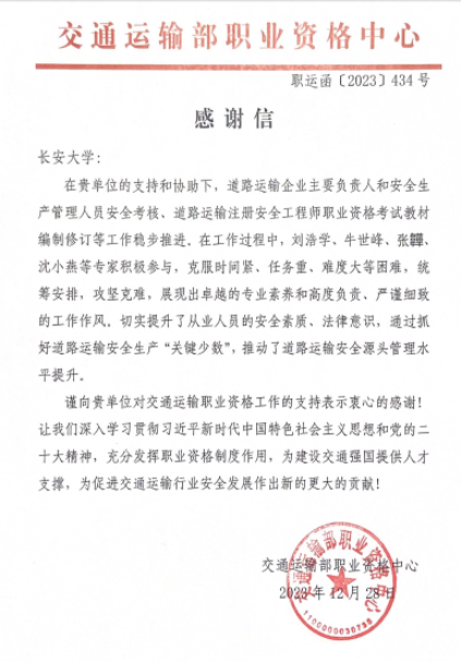 信中表示,在道路运输企业主要负责人和安全生产管理人员安全考核、道路运输注册安全工程师职业资格考试教材编制修订等工作中,KY.COM汽车学院刘浩学、牛世峰、张韡、沈小燕等教师积极参与,统筹规划,攻坚克难,展现出KY.COM教师卓越的专业素养和高度负责、严谨细致的工作作风。