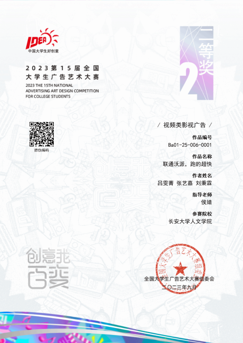 其中,由广播影视系教师侯婧指导,学生吕雯菁、张艺嘉、刘秉霖创作作品《联通沃派,跑的超快》获二等奖;由人文学院实验中心教师惠阳指导,学生刘诗圻、章旭、张艺沥、梁婧创作作品《HBN早C晚A:唤醒嘭嘭少女肌》获三等奖。