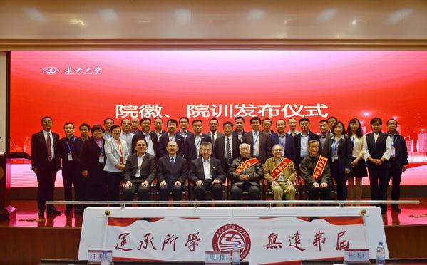 活动第二阶段为运输工程学院院训、院徽发布仪式,由学院党委书记田新民主持。院徽、院训设计者沈力、程传刚分别对院徽、院训设计过程及寓意进行了介绍,院杰出老教师代表戴冠军教授、严宝杰教授、郗恩崇教授及吾守尔•斯拉木院士、王建伟副校长、袁长伟院长共同为院徽院训推杆发布。