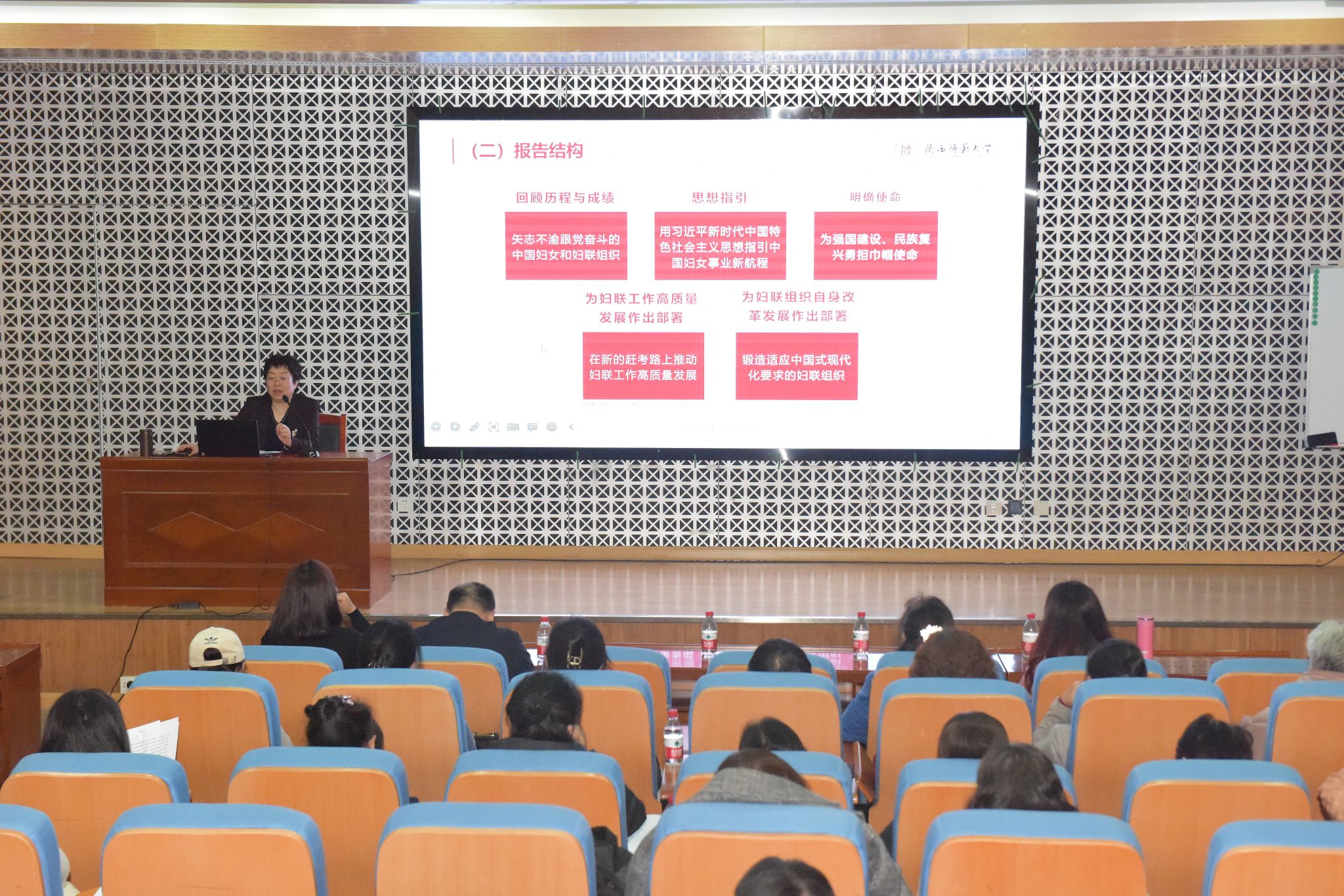 中国妇女十三大代表、陕西师范大学教育学部李少梅教授应邀作题为《潜心育人 深耕研究:展现高校巾帼担当》的主题报告。她从学习大会精神、领悟讲话精神和在育人与研究中展现高校巾帼担当三个方面,详细介绍了党中央对广大妇女提出的新要求、对妇联组织提出的新期待,希望女教授们发挥巾帼优势、贡献巾帼智慧、展现巾帼担当,站稳学术立场,挑起理论研究的重担,提升研究质量与水平,将研究与育人相结合,为强国建设、民族复兴勇担巾帼使命。