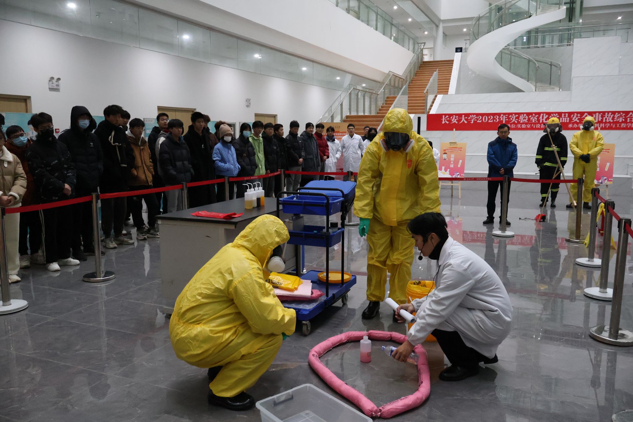 会后,为了进一步加大安全生产宣传力度,增强现场应急处置能力,参会人员赴北校区致远大厦一楼大厅,观摩了由实管处、材料学院、建工学院联合组织的实验室安全事故综合应急演练。