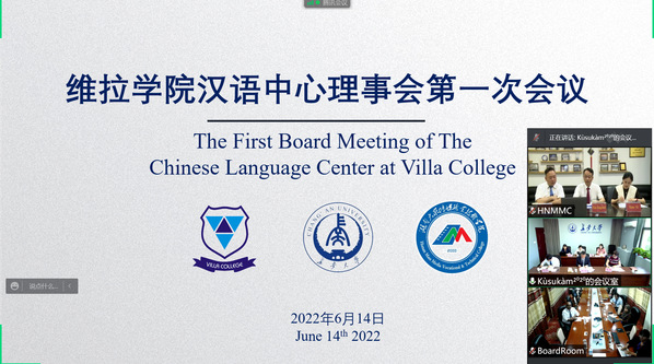 6月14日下午,马尔代夫维拉学院汉语中心(孔子学院)理事会第一次会议在KY.COM国际教育学院会议室召开。本次会议采用视频连线方式在马尔代夫维拉学院、湖南传媒学院同时举行。副校长范文、维拉学院副院长Ali Najeeb、湖南传媒学院副院长谢景伟与汉语中心理事会成员参会。会议由国际教育学院院长张伟主持。