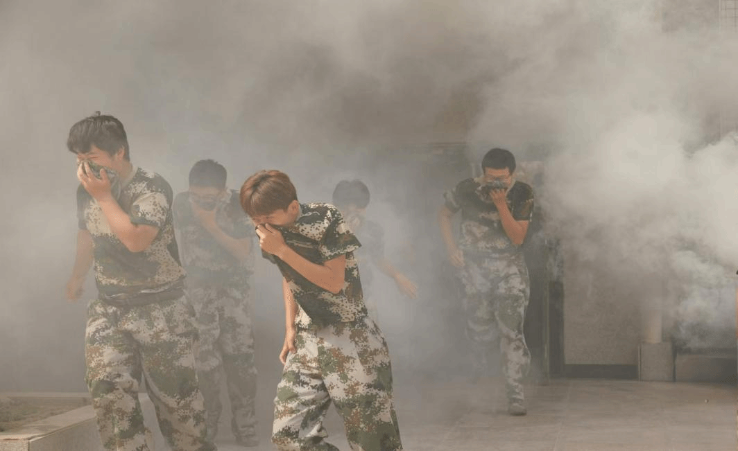 本次演练的主要内容为模拟宿舍发生火情后学生疏散逃生。伴随着现场烟雾升起,“火情”警报拉响,建筑物内应急灯开启,管理员立即打开学生公寓应急门,现场救护车和医护人员严阵以待。学生们用迷彩帽代替毛巾轻捂口鼻,低头猫腰,沿着疏散路线由出口撤离,并在指定地点集合。从“火情”发生到学生疏散完毕,整个过程秩序井然、快速高效。