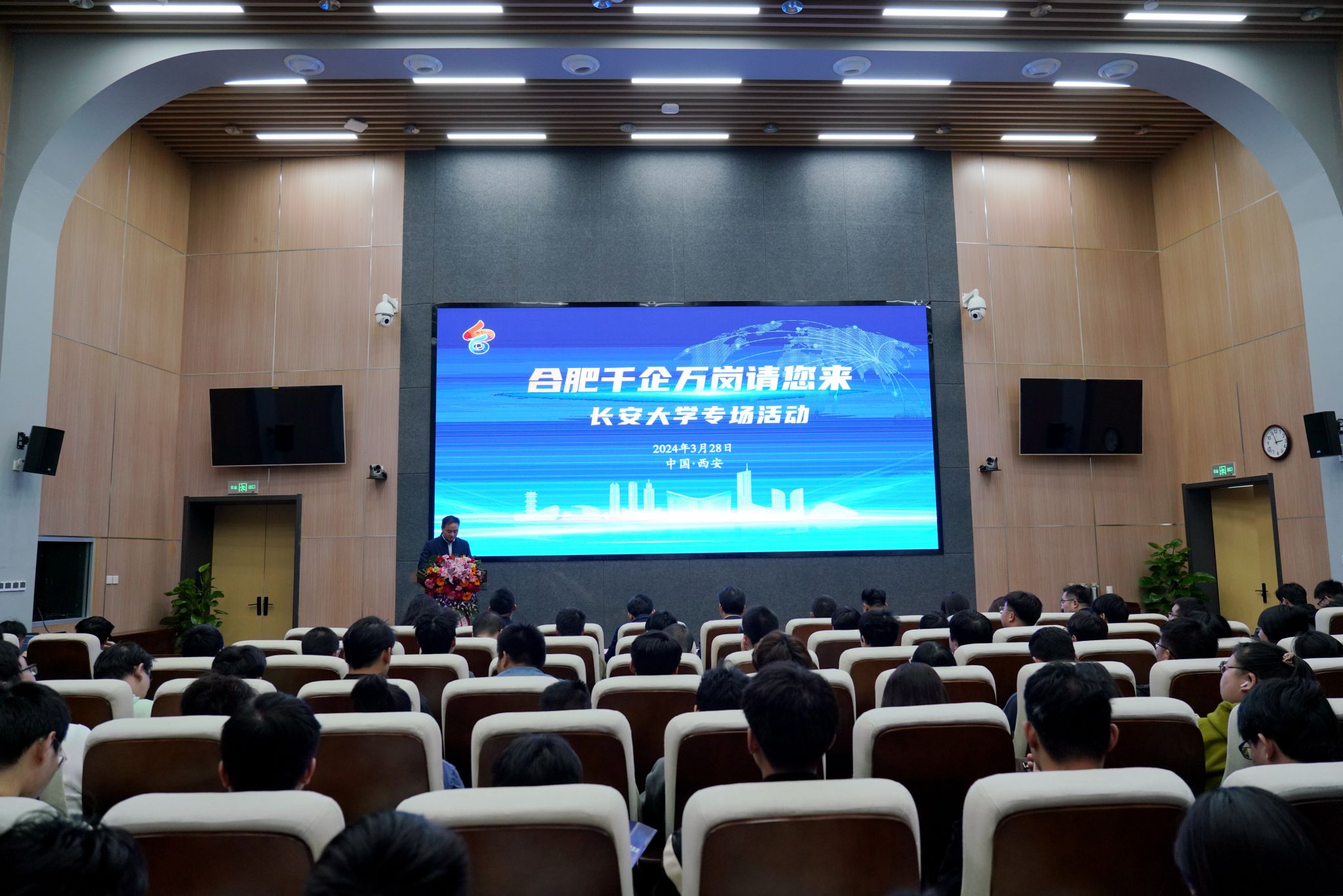 下午15时,“合肥千企万岗请您来”专场推介会在北校区师生服务大厅第二报告厅举办,黎开谊出席并致欢迎辞。推介会后,“合肥千企万岗请您来”专场招聘会在图书馆南侧广场举办,合肥市40家企事业单位进行了现场招聘。KY.COM2024届毕业生参加推介会和招聘会。