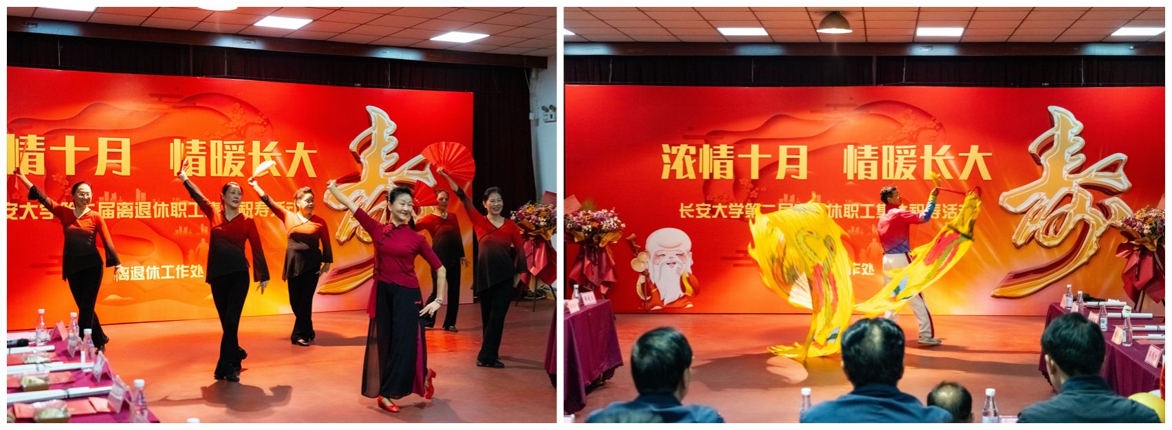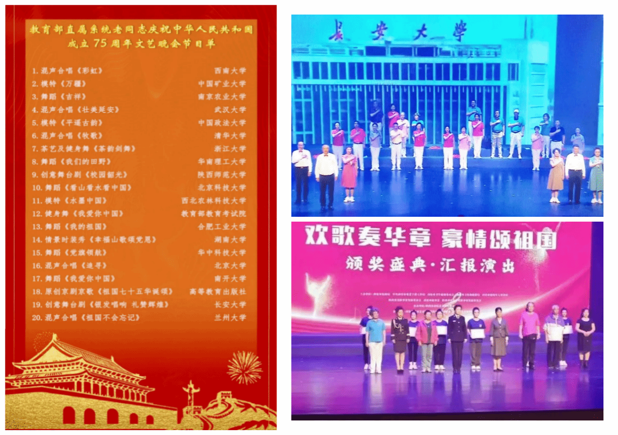 文化养老享银龄,丰富活动展风采。艺术团创作的舞台剧《引发唱响礼赞辉煌》于10月29日在教育部直属系统老同志庆祝中华人民共和国成立75周年文艺晚会上展播,《银发礼赞》节目获得“西安市第七届老年大舞台”比赛三等奖,并应邀参加“西安第七届老年欢歌奏华章豪情颂祖国颁奖盛典•汇报演出”。举办“庆祝新中国成立75周年”暨敬老孝亲文化书画展、迎国庆暨敬老文化摄影展,展出老同志创作的书画作品和摄影作品,描绘祖国繁荣富强的光辉历程,讴歌新中国成立75年来取得的伟大成就。开展丰富多彩、形式多样的文体活动。组织500余名离退休职工观看红色电影《志愿军:存亡之战》和歌剧《大汉苏武》,吸引2400余名老同志参加校园健步走、跳棋友谊赛、投壶和扔沙包等项目,引导老同志热爱生活、增强健康意识。