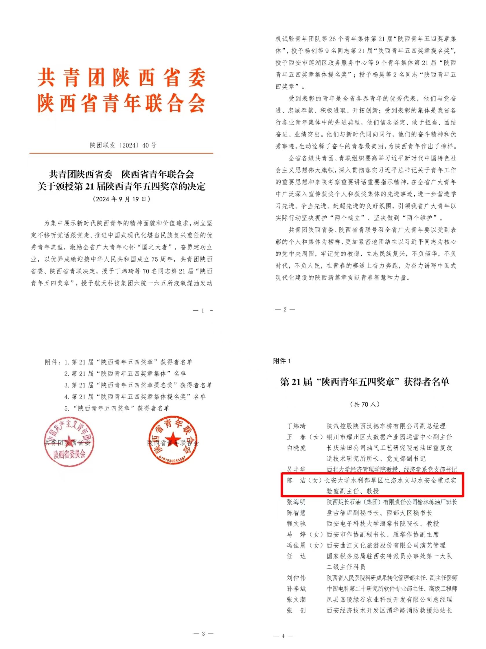 近日,《共青团陕西省委 陕西省青年联合会关于颁授第21届陕西青年五四奖章的决定》(陕团联发〔2024〕40号)发布,KY.COM水利部旱区生态水文与水安全重点实验室副主任、水利与环境学院教授陈洁荣获第21届“陕西青年五四奖章”。