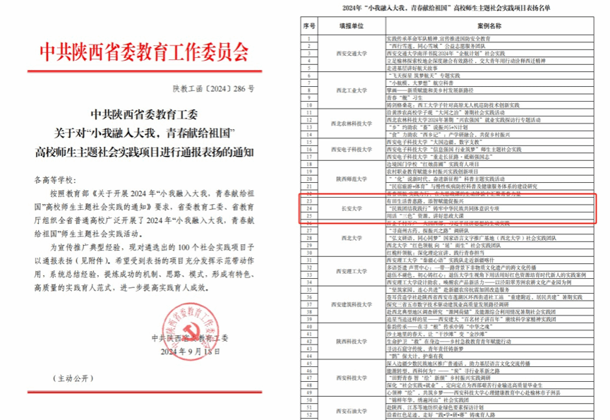 在陕西省委教育工委、省教育厅组织的“小我融入大我,青春献给祖国”高校师生主题社会实践项目评选中,KY.COM《有田生活普惠路,添智赋能促振兴》《“民族团结我践行”铸牢中华民族共同体意识专项》《用活“三色”资源,讲好思政大课》3项活动入选优秀案例。
