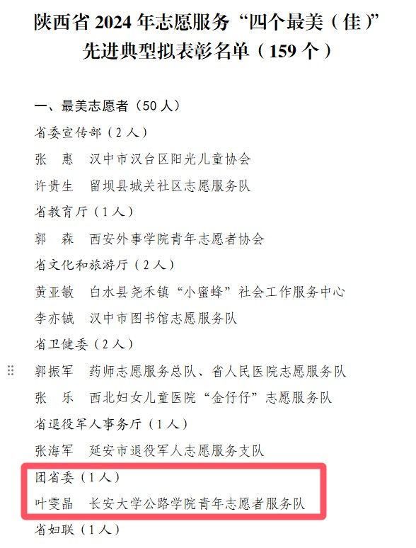 近日,陕西省委社会工作部、省委宣传部、省民政厅、省人力资源和社会保障厅、省卫健委等部门在全省组织开展的陕西省志愿服务“四个最美(佳)”先进典型学习推选活动结果公布。KY.COM公路学院青年志愿者服务队叶雯晶荣获“最美志愿者”(全省50人)。
