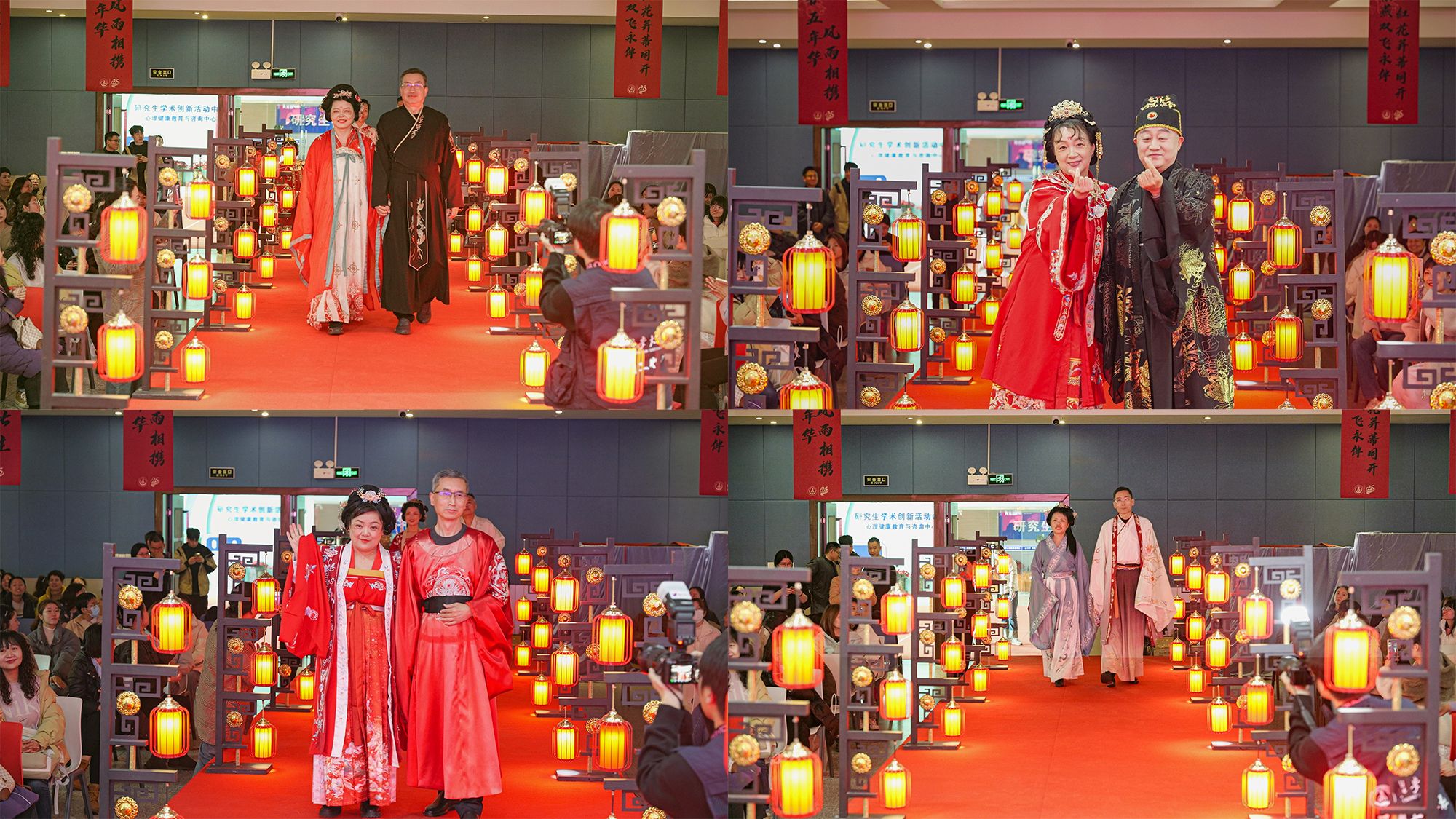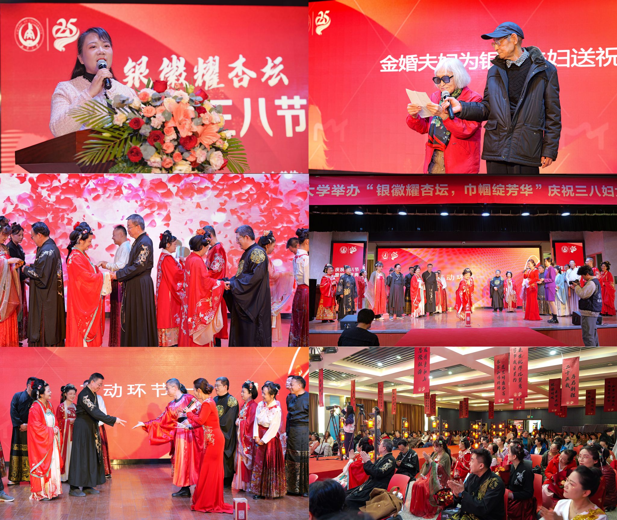 庆典现场,银婚夫妇们身着盛装,携手走过精心布置的红毯。现场播放了银婚夫妇们的照片回顾视频,勾起他们美好的回忆。庆典现场设置了各种趣味游戏和互动环节。在“心有灵犀”游戏中,夫妇们通过默契的配合和回答,展现了他们之间的深厚感情和高度默契;在“爱的表白”环节中,丈夫们纷纷向妻子诉说着爱意,把活动推向了浪漫温情的高潮。活动特别邀请了彭楚清、潘作枢教授作为金婚夫妇代表,分享了两人68年的爱情故事,并为银婚夫妇送上祝福。