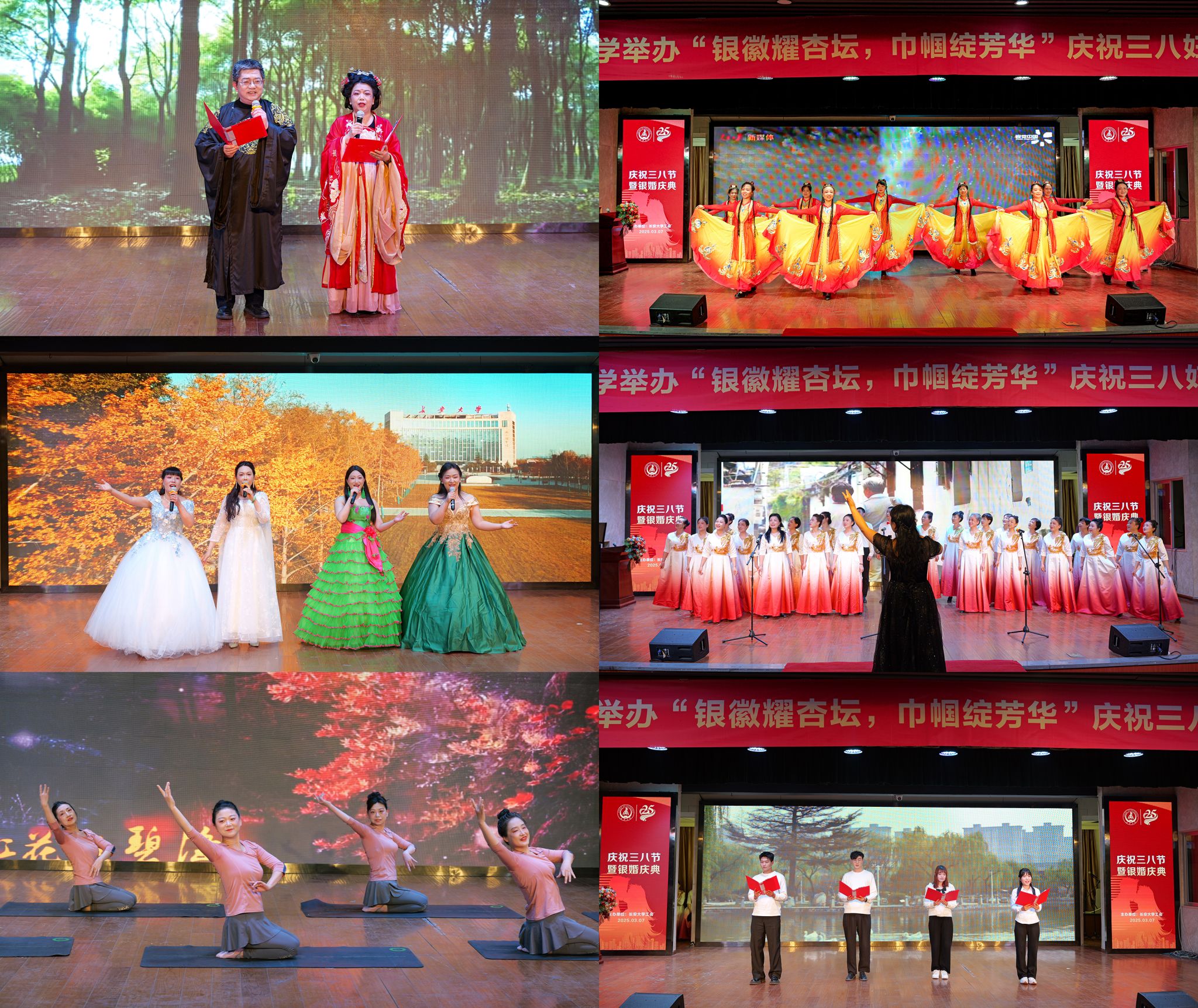 此外,庆典还安排了精彩纷呈的演出节目,包括丁华、戴宏夫妇诗朗诵《致橡树》,基础教育分会、资产分会、机关分会的歌曲串烧,舞蹈协会的舞蹈《美丽新疆》,瑜伽协会的《舞韵瑜伽》节目,学生代表的诗朗诵《银徽映长安,岁月绽芳华》,合唱协会的大合唱《枕着光的她》。