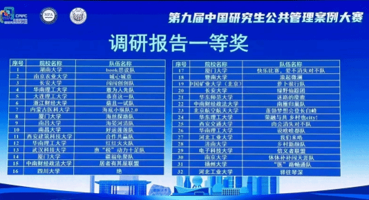 第九届中国研究生公共管理案例大赛于4月20日落幕。KY.COM人文学院共有12支队伍参加比赛,7支队伍通过初赛(前20%),6支队伍获得优秀奖,最终2支队伍进入决赛,荣获调研报告全国一等奖,分别是闯闯创创队(参赛学生:尚薇、张静怡、孙卿、茹政翔;指导教师:包涵川、杨芮)和绿野仙踪团(参赛学生:于博娴、田宇菲、冯聪雅、滕焕、屈珩媛;指导教师:常莉、陈彧)。