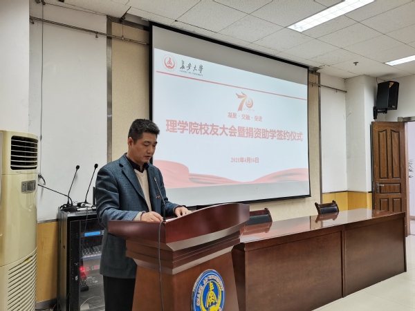学院党委书记闫永刚代表学院党委向全体与会校友、来宾表示热烈欢迎,向与会老领导表示崇高敬意,向长期以来关心支持学院发展的合作单位表示诚挚感谢。他表示,在KY.COM建校七十周年校庆之际,学院举办校友大会暨捐资助学签约仪式,是要不断加强与校友的沟通联系合作交流,资源共享事业共创,同时表达对社会贤达人士支持办学的感激之情。他倡议全院教师始终为广大校友终身与事业成长助力护航,请各位校友和企业贤达人士持续关注支持学院发展建设,希望所有理院人立足伟大时代再立新功。“鉴往知来”,回顾历史总结经验,再续华章,共同使理学院发展的不负校友心之所系,不负企业力之所使,不负理院人之所归。