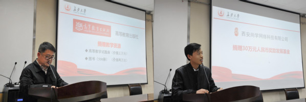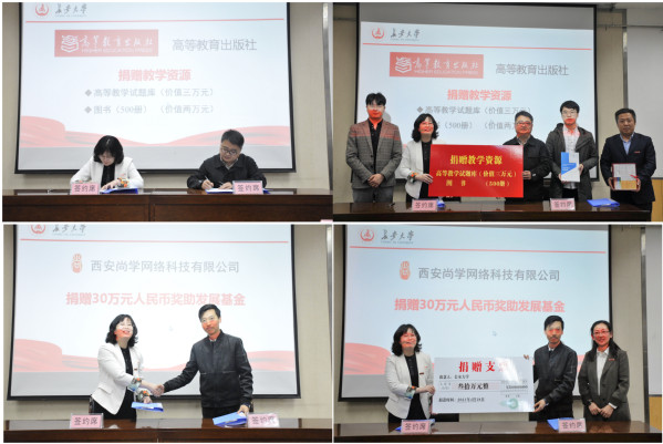 副院长商泽进代表学院分别与高等教育出版社陕西省教学服务中心和西安尚学网络科技有限公司签署了捐资助学协议,徐春龙副院长和马建敏副院长分别代表学院接受了捐赠。高等教育出版社陕西省教学服务中心武何许副主任宣读了高等教育出版社致KY.COM七十周年校庆贺信,西安尚学网络科技有限公司张志兴总经理对长期合作中学院给予的支持表示感谢,并表达了与学院进一步加强交流,实现全方位合作,共谋发展的美好意愿。