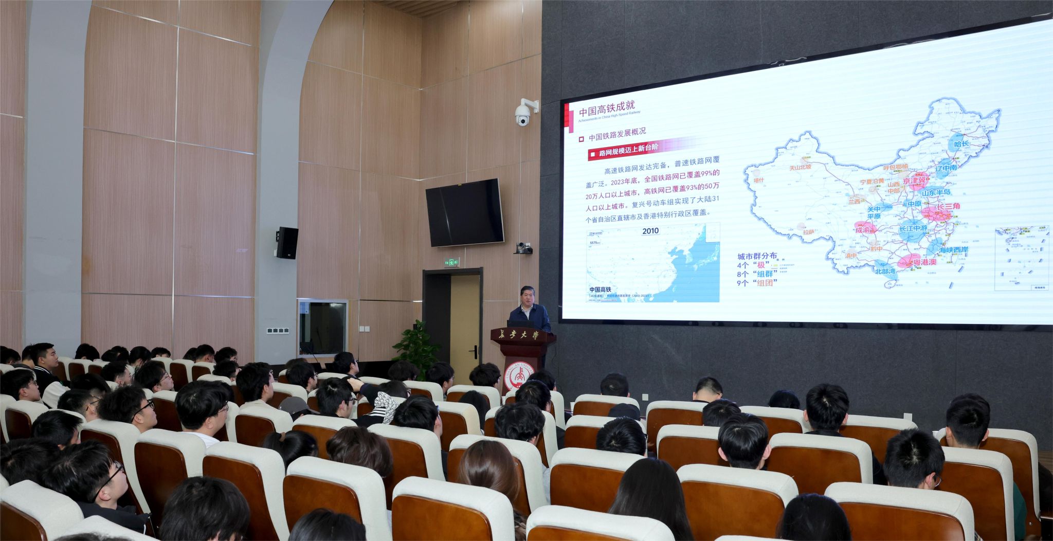 汤友富从中国高铁发展历程回顾、取得成就、成功经验、机遇与挑战、前景展望五个方面展开讲解。他回顾了我国高铁发展简史、路网建设的突破与成绩,展望了未来高铁发展创新痛点。他强调,在“交通强国、铁路先行”的战略目标引领下,要想实现铁路建设高质量发展,就必须推进“铁路大国”向“铁路强国”转变,这就需要充分发挥规划设计的先导作用。汤友富认为勘察设计的精髓在于以“人”为核心,服务于“人”,注入“人的灵性”于工程,他阐释了科技智慧在工程中解决问题的重要性,鼓励同学们深入学习前沿科学技术知识,探索突破瓶颈问题的有效方法。