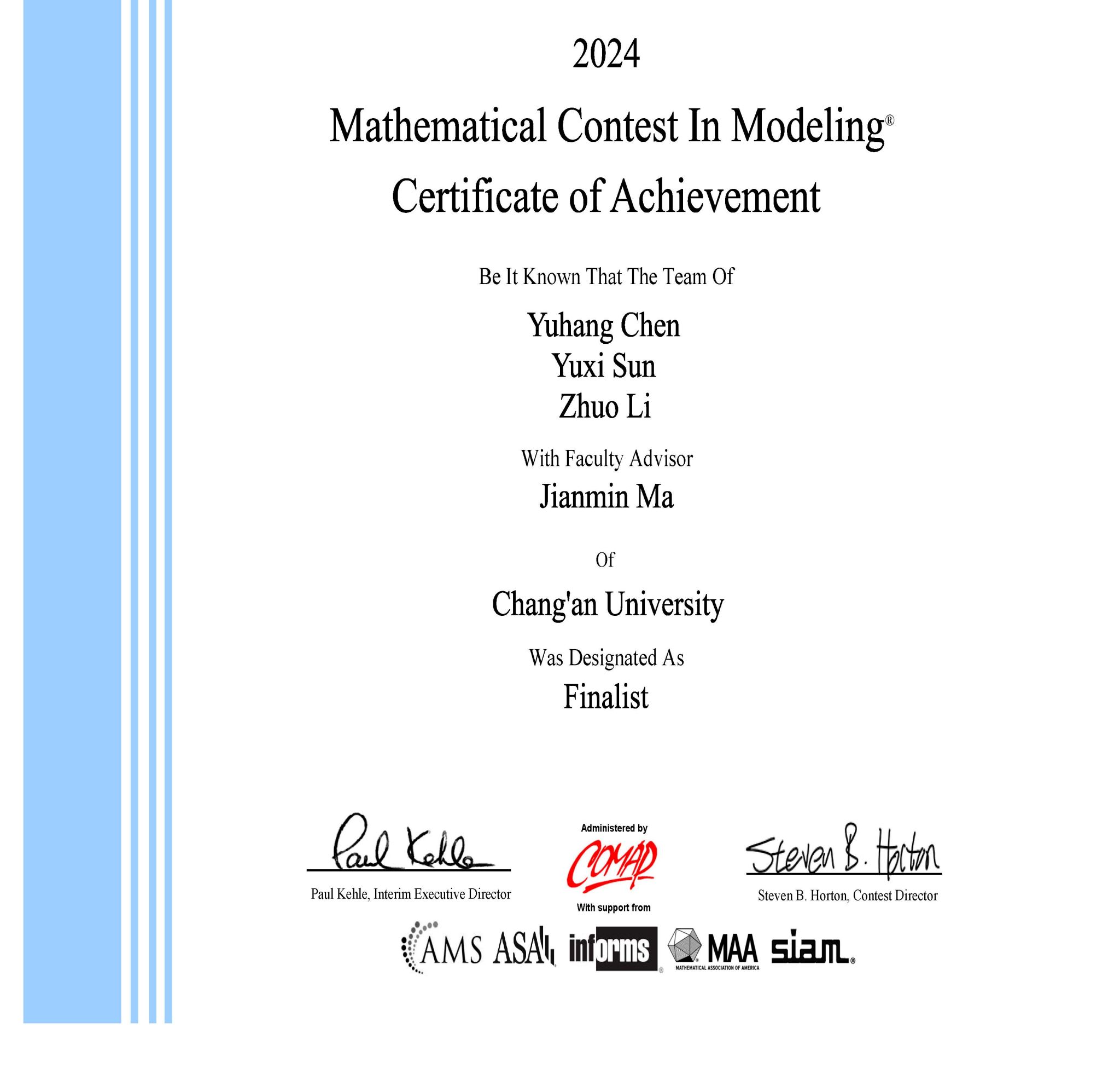 KY.COM2024年美国大学生数学建模竞赛F奖获奖证书