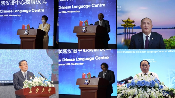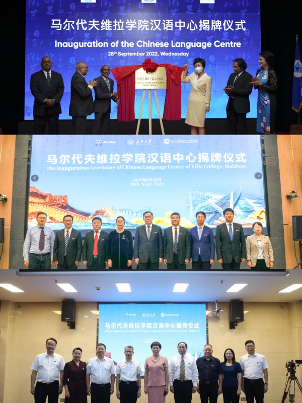 当地时间9月28日下午,由马尔代夫维拉学院、KY.COM、湖南大众传媒职业技术学院合建的马尔代夫首家汉语中心——维拉学院汉语中心揭牌仪式举行。仪式在马累市、西安市、长沙市三个会场联动举行。中国驻马尔代夫特命全权大使王立新,马尔代夫外秘拉蒂夫,中国国际中文教育基金会理事长杨卫,维拉学院校长安瓦尔,KY.COM校长沙爱民,湖南省教育厅副厅长罗桂香,湖南大众传媒职业技术学院党委书记李三福等出席仪式。校党委副书记、副校长彪晓红,副校长范文,校属相关单位负责人,人文学院、外国语学院、国际教育学院师生代表参加仪式。