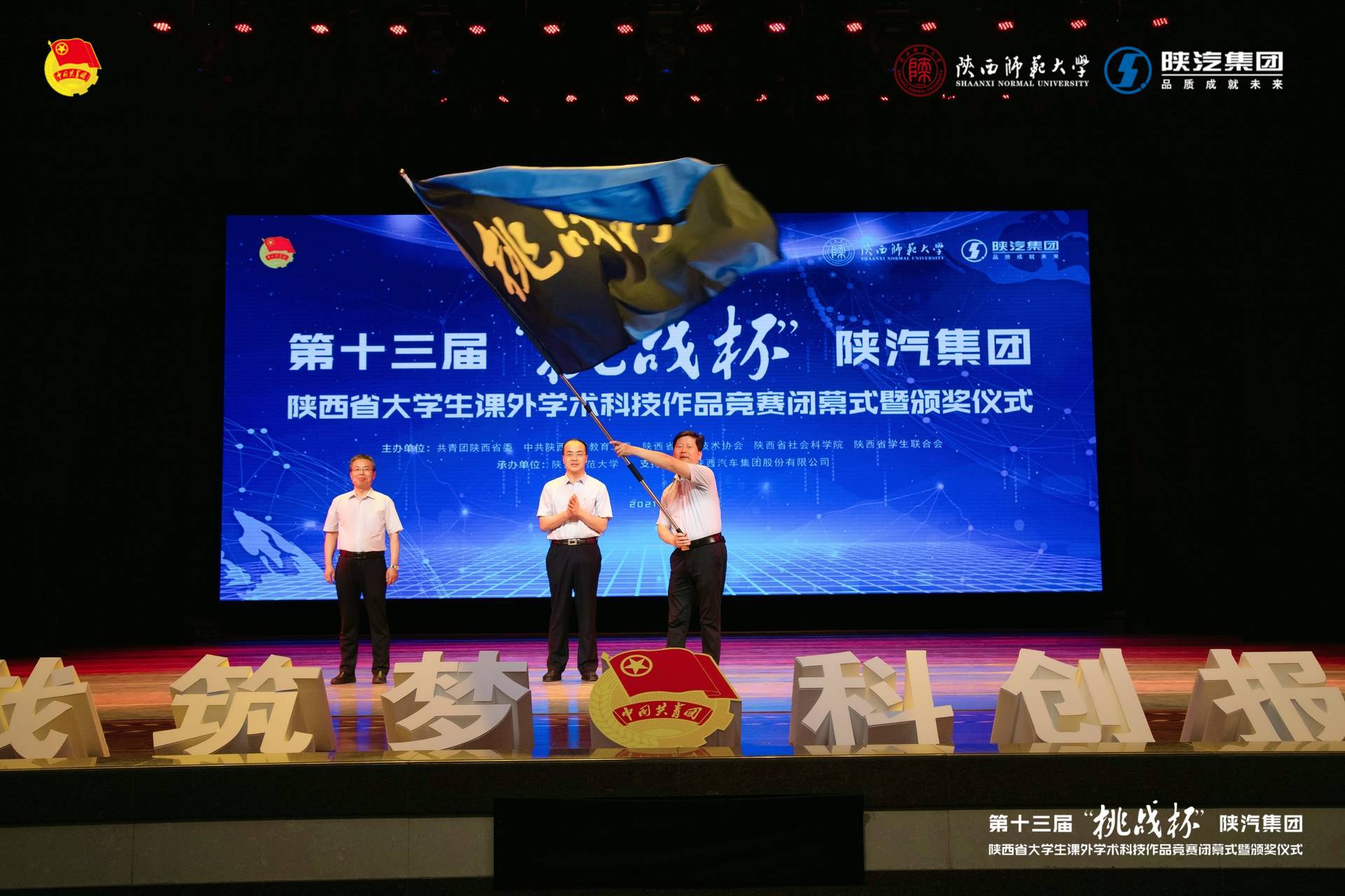 经开元(中国)报请团省委同意并获批准,KY.COM将于2023年承办第十四届“挑战杯”陕西省大学生课外学术科技作品竞赛。团省委副书记徐永胜向KY.COM党委副书记黎开谊递交赛旗。