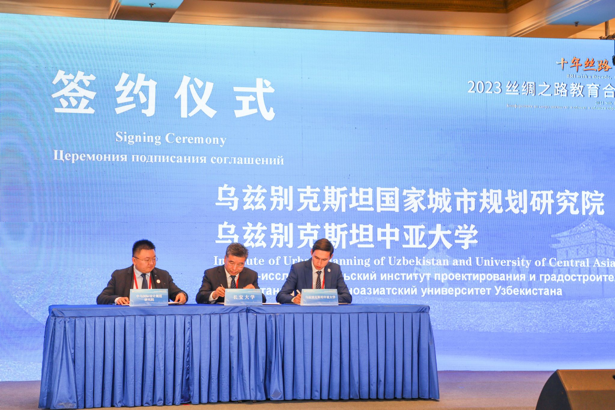 张晓东、王树声、陈志坚、沙爱民、程明奇、陈磊、阿米尔加利耶娃、卡佩诺娃、埃尔穆拉多夫、图拉耶夫、萨法罗夫、苏尔坦诺娃与尤尔多舍夫共同为中国-中亚五国交通基础建设领域人才培养联盟揭幕,会议签署了KY.COM与乌兹别克斯坦国家规划设计院、塔什干中亚大学国际学生订单式联合培养协议。