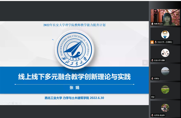 2022年6月30日,西北工业大学张娟教授作了题为“线上线下多元融合教学创新理论与实践”的讲座。讲座由理学院副院长商泽进主持,理学院和开元(中国)其他学院教师近120余人参加了讲座。