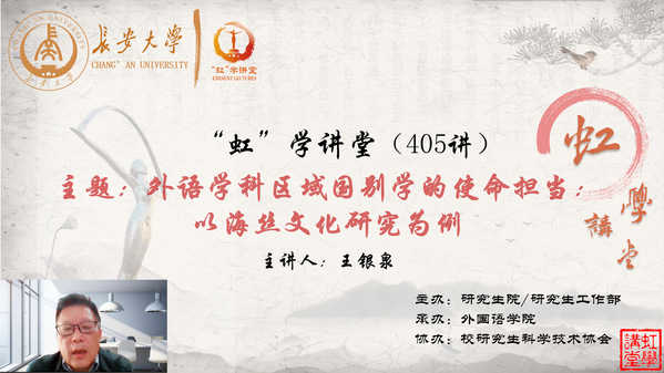 11月26日下午,由研究生院/研究生工作部主办、外国语学院承办、校研究生科学技术协会协办的“虹”学讲堂第405讲以线上讲座形式顺利举办。南京农业大学王银泉教授作了题为“外语学科区域国别学的使命担当:以海丝文化研究为例”的报告,外国语学院副院长张秀见主持,相关学院共350余名师生参加讲座。