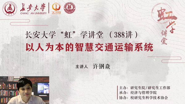 6月23日晚,由研究生院/研究生工作部主办、经济与管理学院承办、校研究生科学技术协会协办的“虹”学讲堂第388讲以线上讲座形式举行。香港理工大学许钢焱教授作了题为“以人为本的智慧交通运输系统”的报告,相关学院共160余名师生参加讲座。