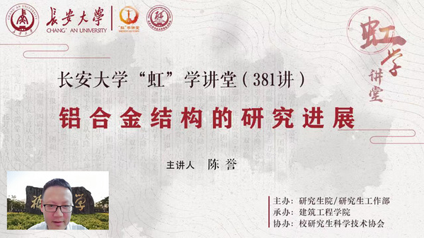 6月6日下午,由研究生院/研究生工作部主办、建筑工程学院承办、校研究生科学技术协会协办的“虹”学讲堂第381讲以线上讲座形式举行。福州大学陈誉教授作了题为“铝合金结构的研究进展”的报告,建筑工程学院院长邢国华主持报告会,相关学院270余名师生聆听讲座。