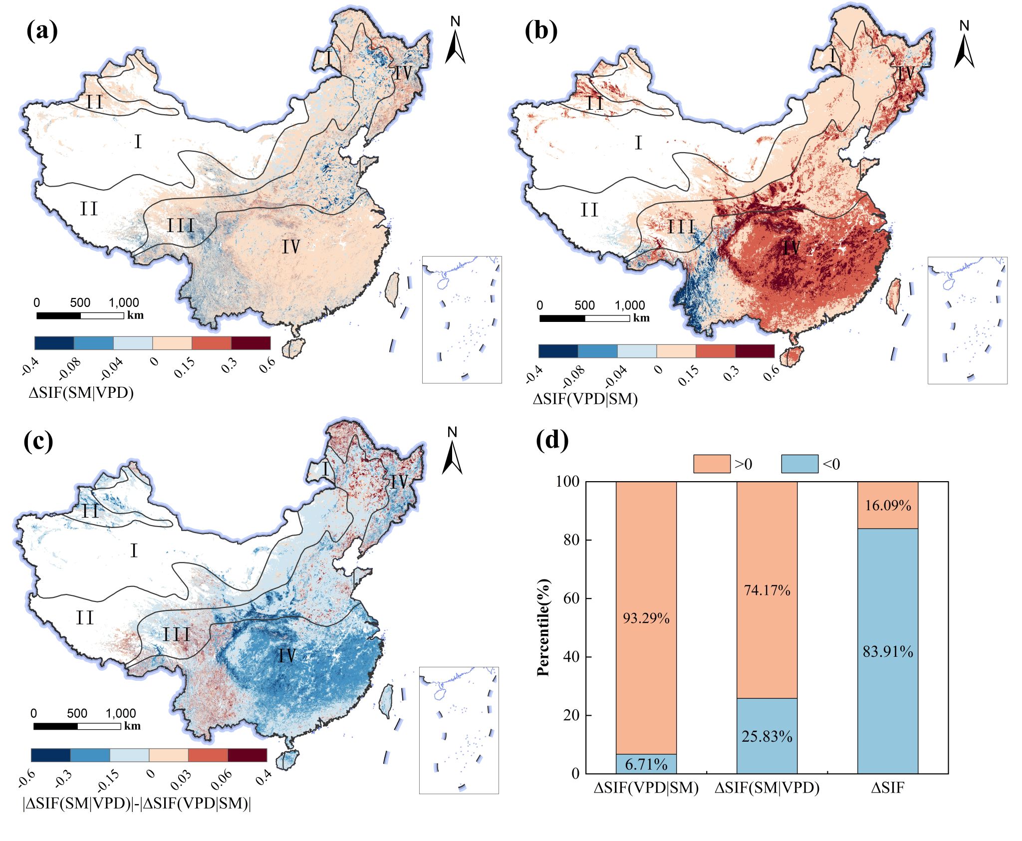 植被生产力作为陆地生态系统碳封存的关键生态过程,其受土壤水分(SM)和饱和水气压差(VPD)的影响在全球范围内尚存争议。本研究基于卫星遥感与地面观测的多源数据,运用太阳诱导叶绿素荧光(SIF)作为植被总初级生产力的关键指标,对中国陆地生态系统植被生产力的动态变化及其趋势进行了深入评估。通过分箱解耦方法,量化了SM和VPD对生态系统生产力的相对作用,并分析了其约束效应及阈值特性。研究表明,在未来构建陆地生态系统模型以预测碳吸收变化时,应充分考虑SM与VPD的交互作用,这对于区域尺度上准确揭示植被生产力长期反馈机制具有重要意义。