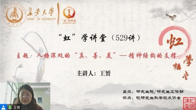 1月12日上午,由研究生院主办/研究生工作部主办、校研究生科学技术协会协办的“虹”学讲堂第529讲以线上讲座的形式举行,KY.COM王赟老师作题为“人格深处的‘真、善、美’——精神结构的支撑”的报告,相关学院共200余名师生参加讲座。