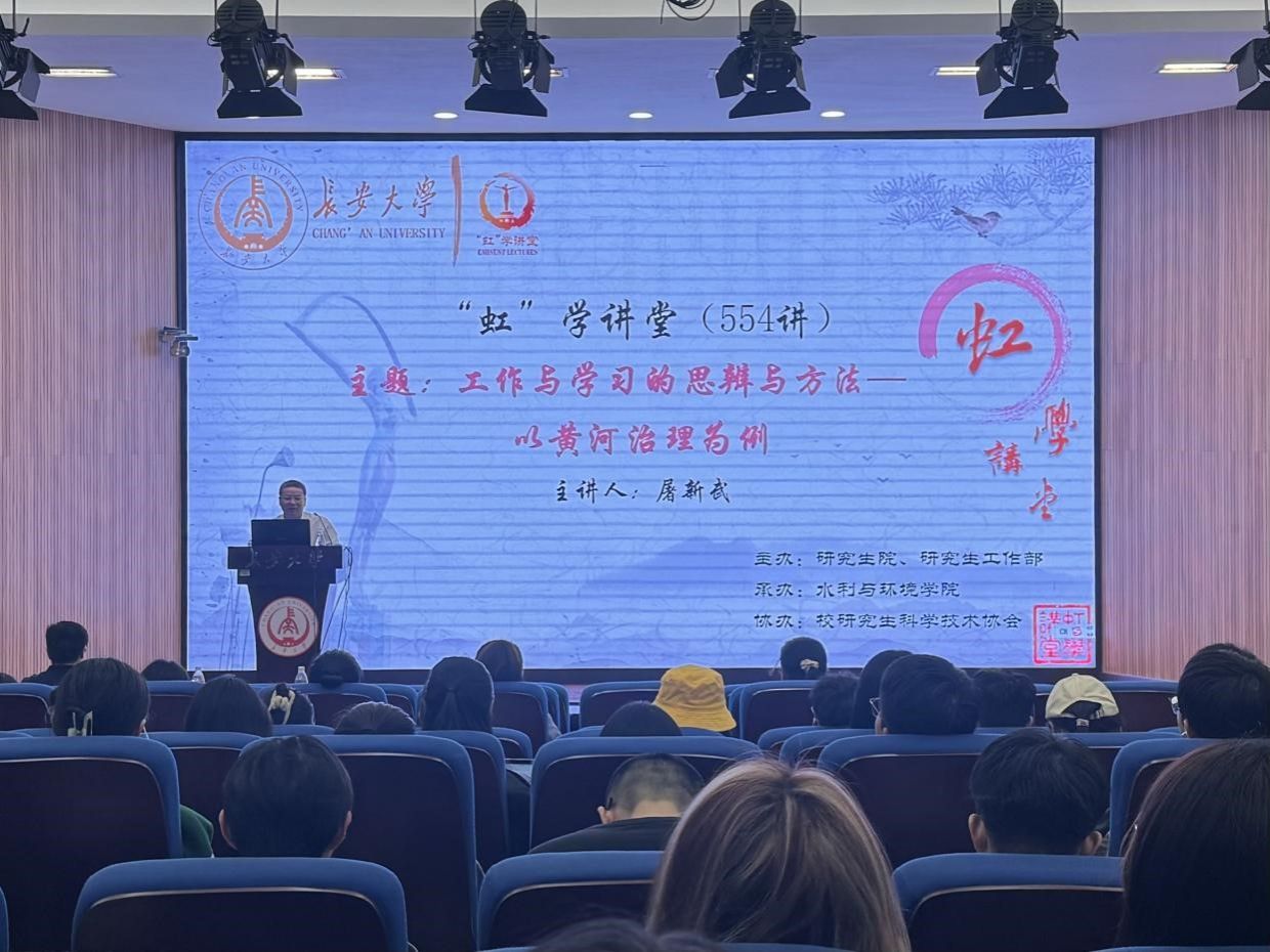 4月29日下午,由研究生院、研究生工作部主办,水利与环境学院承办,校研究生科学技术协会协办的“虹”学讲堂第554讲在南校区东院伯声报告厅举办。河南黄河水文勘测规划设计院教授级高级工程师屠新武作题为“工作与学习的思辨与方法——以黄河治理为例”的报告,水利与环境学院杨银科教授主持,相关学院共160余名师生参加讲座。