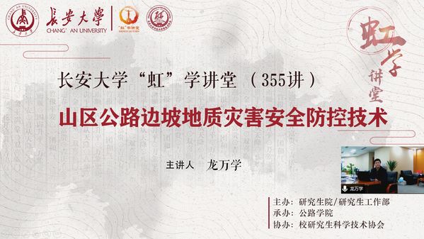 4月1日下午,由研究生院/研究生工作部主办、公路学院承办、校研究生科学技术协会协办的“虹”学讲堂第355讲以线上讲座形式举行。贵州省交通规划勘察设计研究院龙万学研究员作了题为“山区公路边坡地质灾害安全防控技术”的报告,相关学院共400余名师生参加讲座。