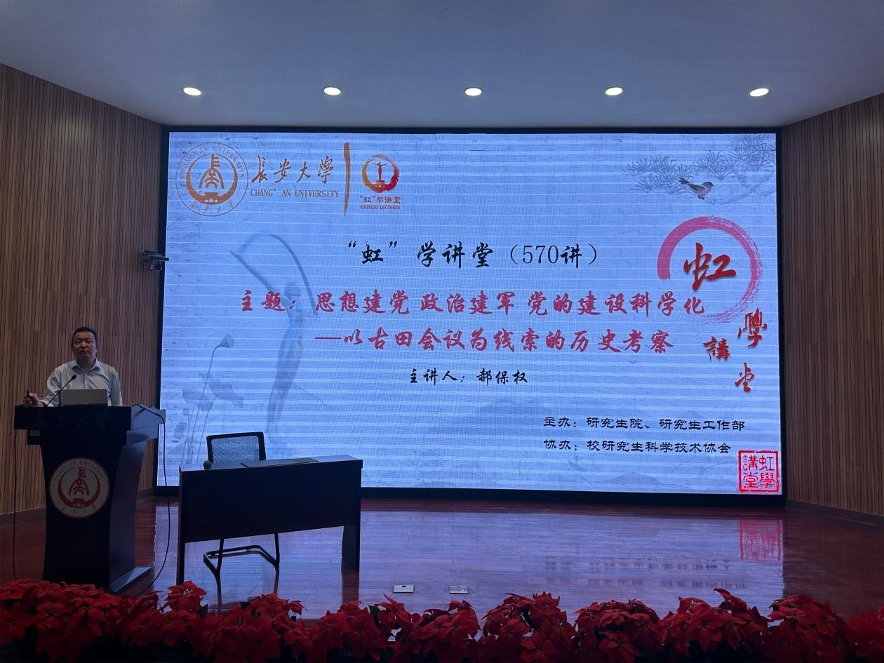 5月28日下午,由研究生院、研究生工作部主办,校研究生科学技术协会承办的“虹”学讲堂第570讲在南校区东院伯声报告厅举办。西北工业大学郝保权教授作题为“思想建党、政治建军、党的建设科学化——以古田会议为线索的历史考察”的报告,各学院研究生党支部书记参加讲座。