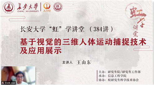 6月9日晚,由研究生院/研究生工作部主办、信息工程学院承办、校研究生科学技术协会协办的“虹”学讲堂第384讲以线上讲座形式举行。英特尔中国研究院高级主任研究员王山东作了题为“基于视觉的三维人体运动捕捉技术及应用展示”的报告,相关学院共150余名师生参加讲座。