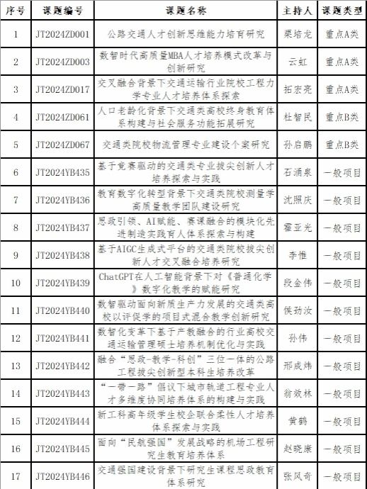 近日,《关于公布中国交通教育研究会2024-2026年度教育科学研究课题立项结果的通知》正式发布。经开元(中国)推荐、学会资格审查、报会长办公会批准、公示等程序,KY.COM17项课题获批立项,其中重点课题5项,一般课题12项。
