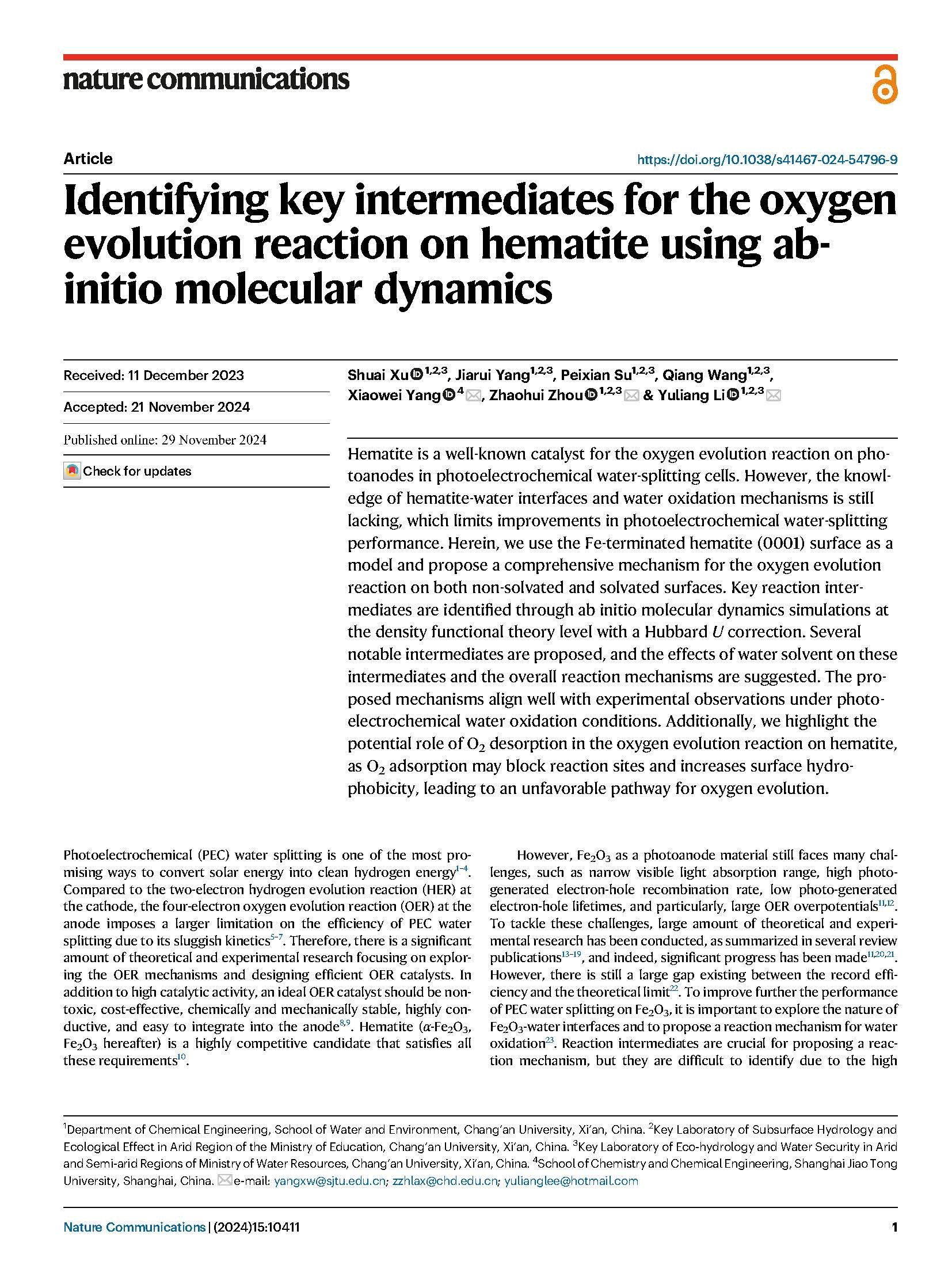 11 月 29 日,KY.COM水利与环境学院李宇亮教授/周朝晖副教授在《自然》(《Nature》)杂志子刊《自然·通讯》(Nature Communications)在线发表了题为“Identifying key intermediates for the oxygen evolution reaction on hematite using ab-initio molecular dynamics”的研究论文(Article)。KY.COM为第一署名单位和第一通讯单位。第一作者为KY.COM博士研究生徐帅,李宇亮/周朝晖和上海交通大学杨晓伟教授作为共同通讯作者。