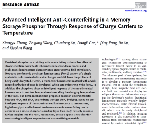 论文信息:X. Zhang, Z. Wang, C. Xu, D. Gao, Q. Pang, J. Xu, X. Wang, Advanced Intelligent Anti-Counterfeiting in A Memory Storage Phosphor through Response of Charge Carriers to Temperature, Laser Photonics Rev. 2024, 2401376.