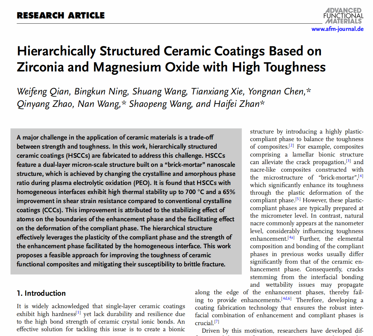 论文信息:W. Qian, B. Ning, S. Wang, T. Xie, Y. Chen, Q. Zhao, N. Wang, S. Wang, H. Zhan, Hierarchically Structured Ceramic Coatings Based on Zirconia and Magnesium Oxide with High Toughness. Adv. Funct. Mater. 2024, 2418312.